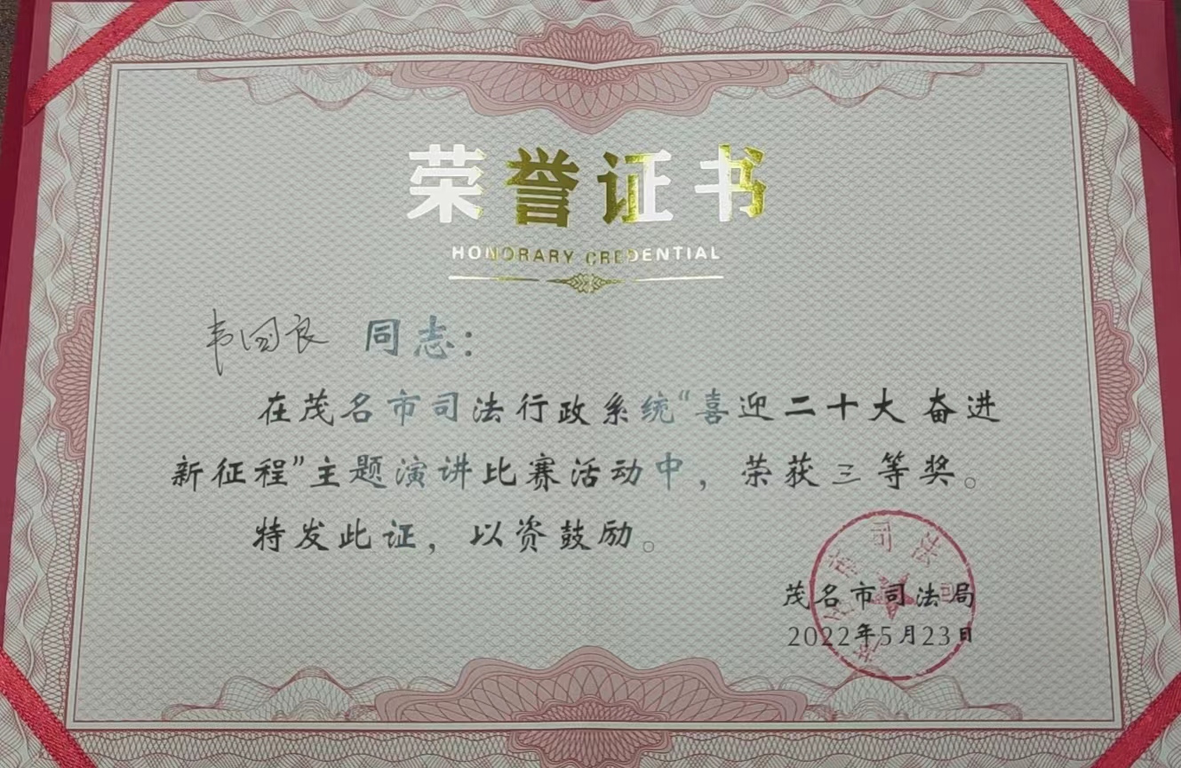 热烈祝贺茂名市正大公证处韦国良代表市公证协会荣获茂名市司法行政系统“喜迎二十大 奋进新征程”主题演讲比赛三等奖。